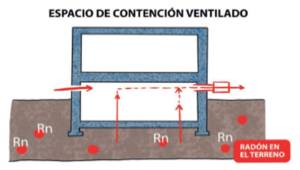 Espacios de contención ventilados: Es un método pasivo si la ventilación se hace de forma natural, y si no es posible, se tiene que implementar una ventilación mecánica. Este método consiste en la creación de cámaras de aire ventiladas que separen el edificio del terreno, permitiendo que el radón se evacúe al exterior.